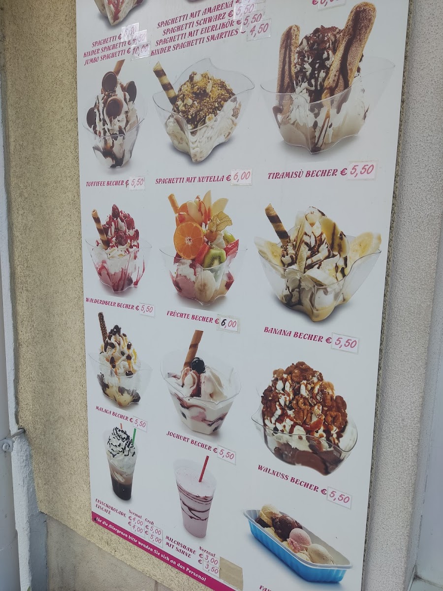 Eisdiele La Crèmery offers a delightful selection of ice cream-based dishes that capture the essence of indulgence. Among the highlights of their menu is the iconic Spaghettieis, a playful and delicious take on pasta, where creamy vanilla ice cream is shaped like spaghetti and topped with fruity sauces and chocolate shavings. For a refreshing twist, the Spaghetti Eis Mit Erdbeeren features the same vanilla ice cream, but with a generous drizzle of sweet strawberry sauce. Those with a preference for a more indulgent flavor can savor the Spaghetti Eis Und Einmal Spaghetti Eis Mit Amarena Kirschen, a combination of vanilla spaghetti ice cream paired with a luxurious layer of Amarena cherries. Another standout, the Spaghetti Eis Amarena, offers a rich, cherry-infused experience that blends perfectly with the classic vanilla base. The variety of choices ensures that there is something to satisfy every sweet tooth, making Eisdiele La Crèmery a must-visit destination for dessert lovers in Bad Rodach.